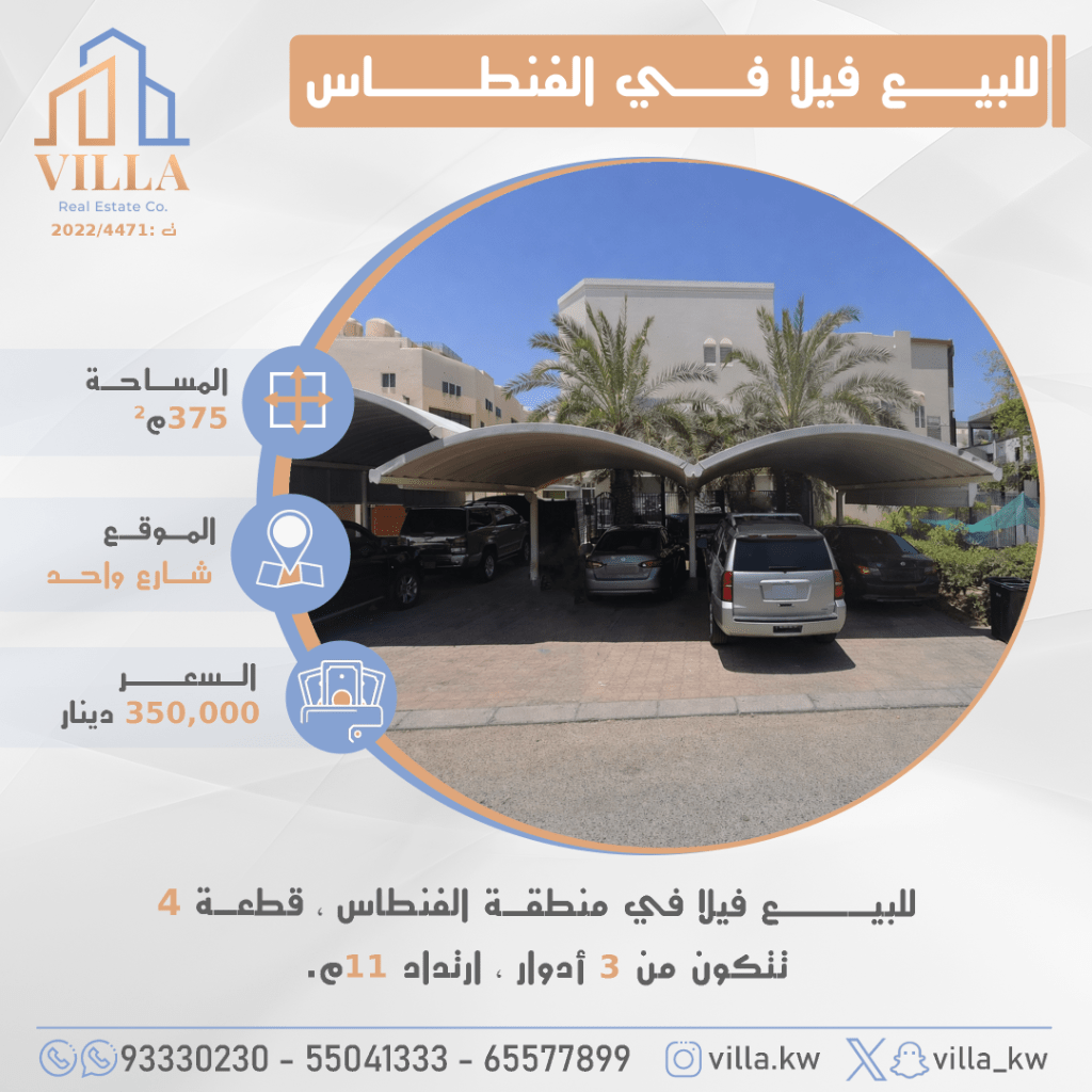 For sale, a villa in the Fintas area, plot 4, area 375 sqm, location on a single street, consisting of 3 floors, setback 11m. Price 350,000 Kuwaiti dinars. For inquiries, mobile 1, mobile 2, mobile 3.