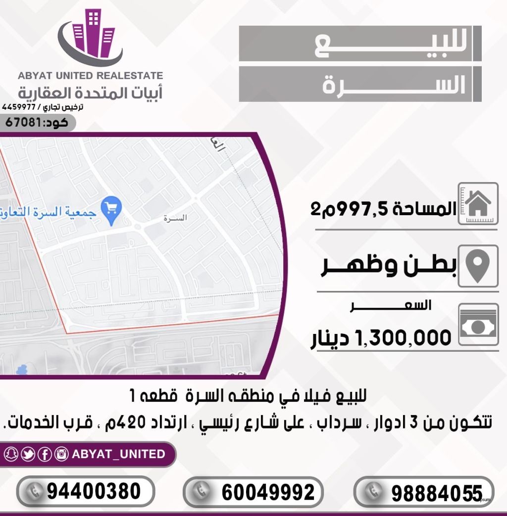 For sale: A villa in the Al-Surra area, Plot 1. The location is prime (front and back). Area: 997.5 m². It consists of 3 floors + a basement. It is on a main street with a setback of 420 m, near services. For inquiries: Mobile 1, Mobile 2, Mobile 3. Price: 1,300,000 dinars. Code number: 67081.