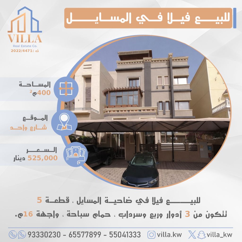 For sale: a villa in Al-Masayil suburb, plot 5, area 400 sqm, located on a single street. It consists of 3 floors, a quarter floor, and a basement, with a swimming pool and a 16m frontage. Price: 525,000 Kuwaiti dinars. For inquiries, call mobile 1, mobile 2, mobile 3.
