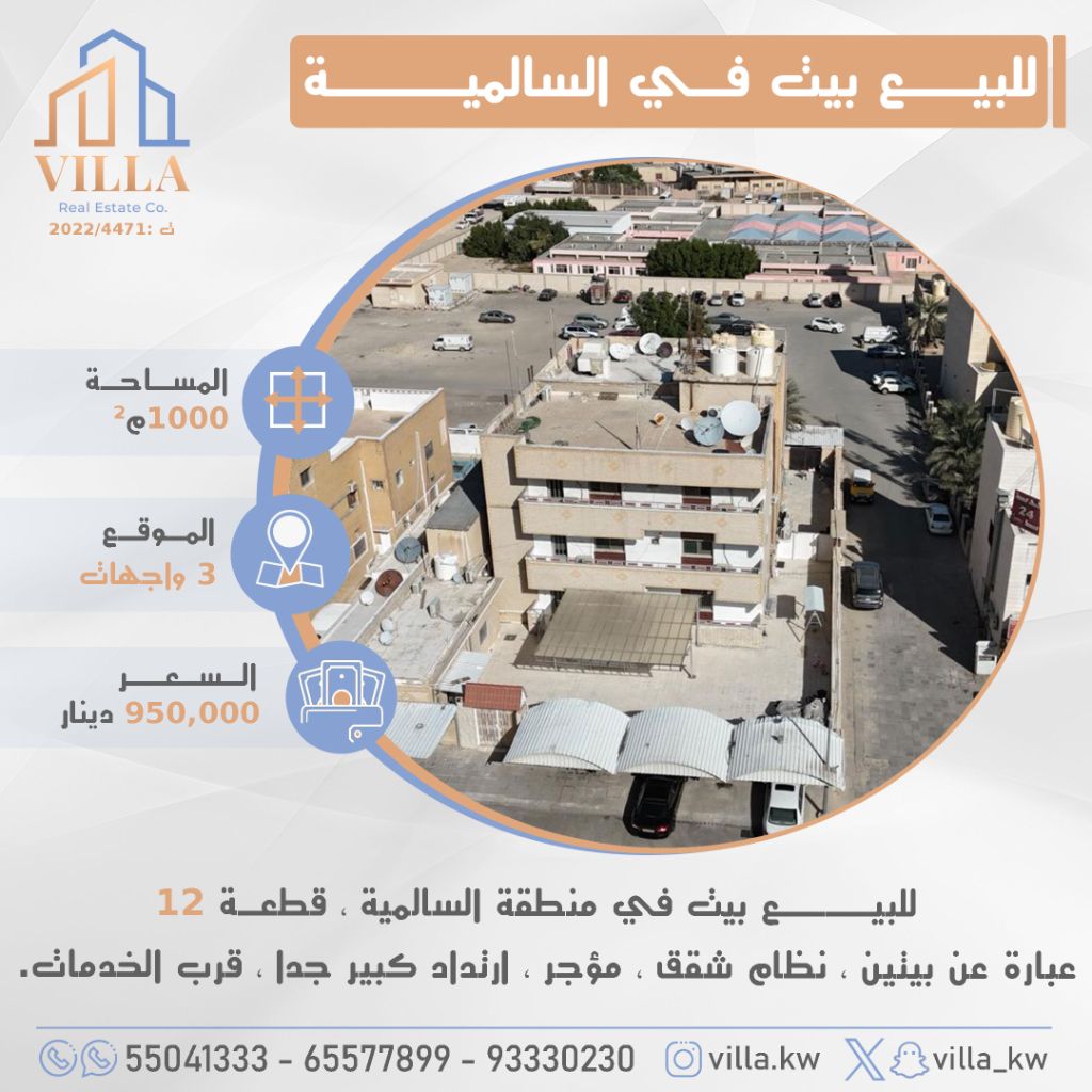 For sale: A house in the Salmiya area, Plot 12, area 1000 sqm, location with 3 facades, consisting of two houses, apartment system, rented, very large setback, near services. Price 950,000 Kuwaiti Dinars. For inquiries, mobile 1, mobile 2, mobile 3.