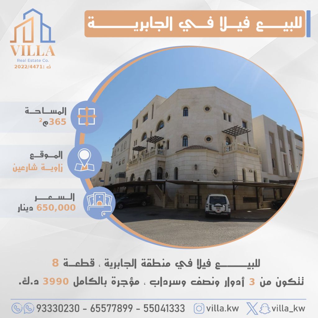 For sale, a villa in Al-Jabriya area, plot 8, area 365 sqm, located at the corner of two streets, consisting of 3.5 floors and a basement, fully rented for 3990 KD, price 650000 KD. For inquiries, mobile 1, mobile 2, mobile 3.