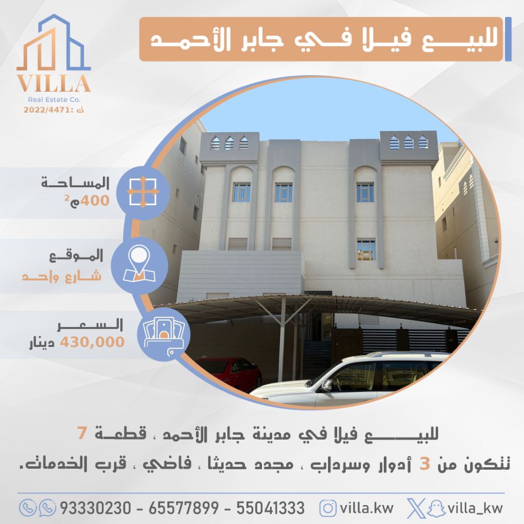 For sale: A villa in Jabir Al-Ahmad City, Plot 7, area 400 sqm, location Chart 1. It consists of 3 floors and a basement, recently renovated, vacant, near services. Price 430,000 Kuwaiti Dinars. For inquiries, mobile 1, mobile 2, mobile 3.