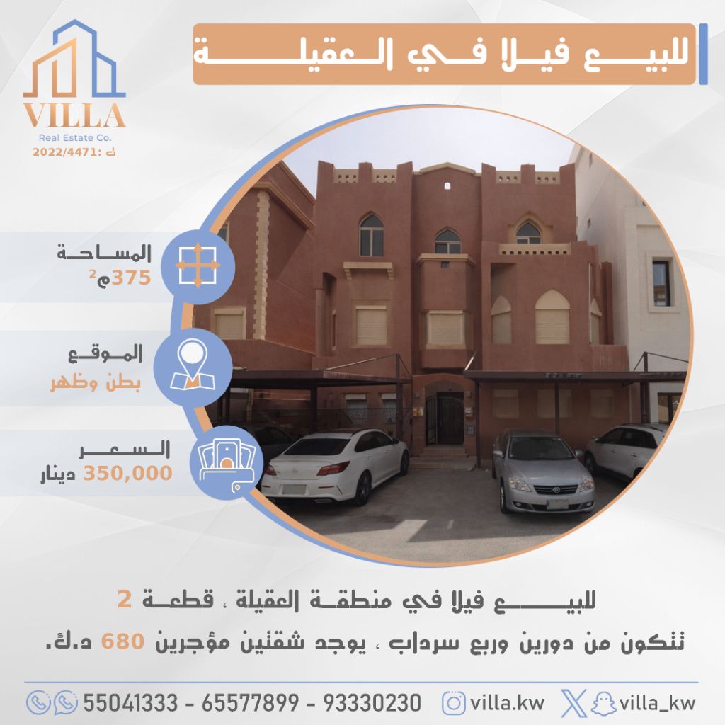 For sale, a villa in the Aqila area, plot 2, area 375 sqm, location with front and back access, consisting of two floors and a quarter basement, includes two rented apartments at 680 KD, price 350,000 KD. For inquiries, mobile 1, mobile 2, mobile 3.