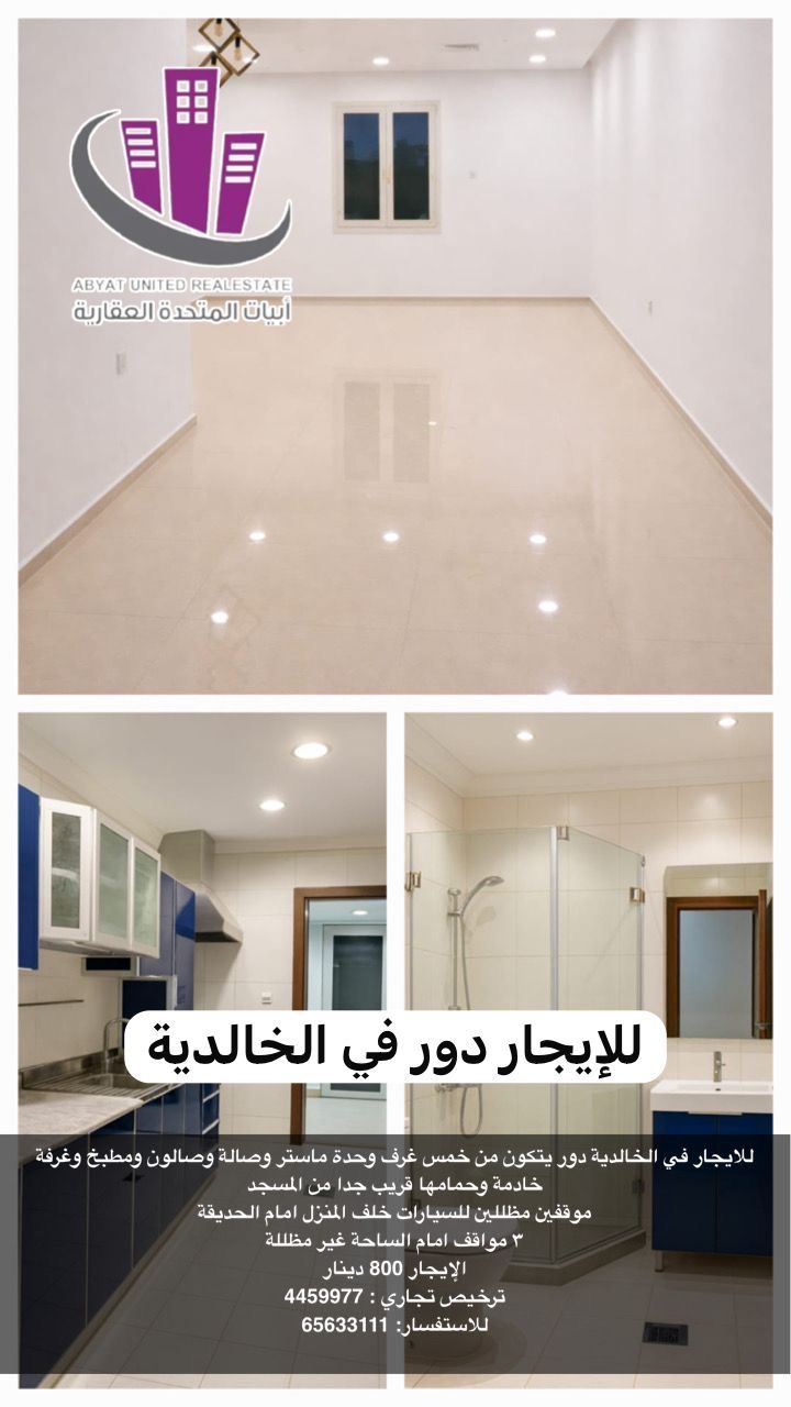 For rent in Al-Khalidiya, a floor consisting of five rooms, a master suite, a living room, a salon, a kitchen, a maid's room with its own bathroom, very close to the mosque, two shaded parking spots behind the house facing the garden, three unshaded parking spots in front of the yard. Rent is 800 dinars, commercial license 4459977. For inquiries, contact United Abiyat Real Estate Company.