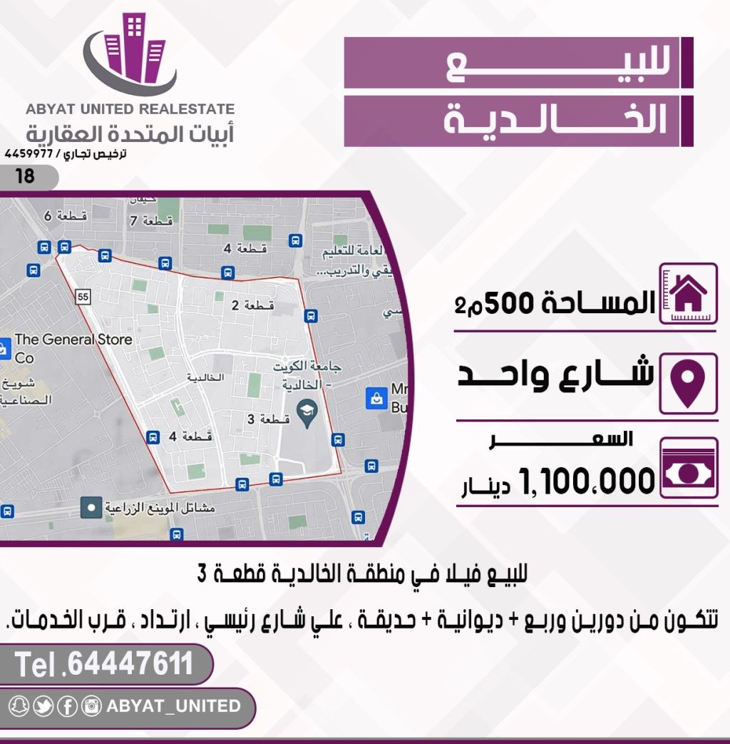 For sale: A villa in the Al-Khalidiya area, Plot 3, with an area of 500 square meters. The location is on a single street, consisting of two floors and a quarter + a diwaniya (reception area) + a garden, on a main street, with setbacks, and near services. For inquiries, mobile number 1 - Price: 1,100,000 dinars.