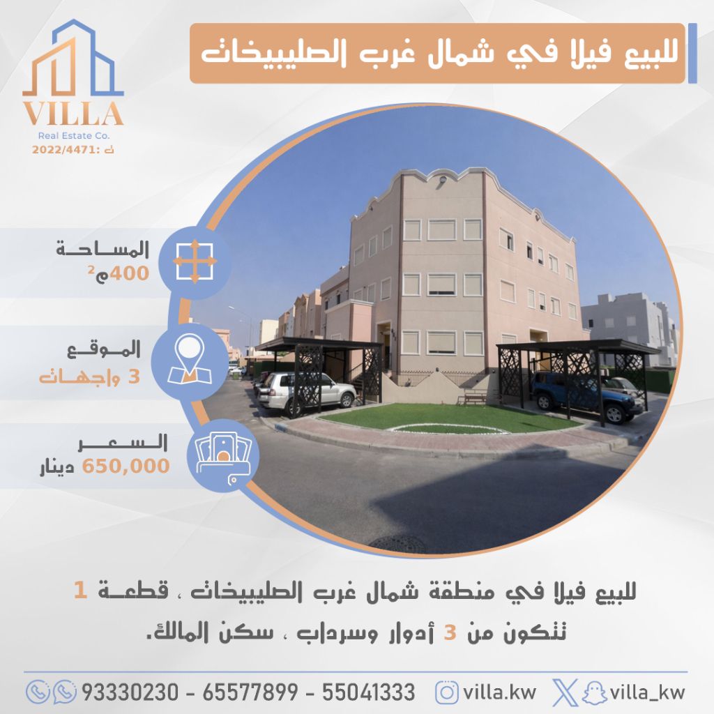 For sale: a villa in the northwest Al-Sulaibikhat area, plot 1, area 400 sqm, location with 3 facades, consisting of 3 floors and a basement, owner-occupied. Price 650,000 Kuwaiti dinars. For inquiries, mobile 1, mobile 2, mobile 3.
