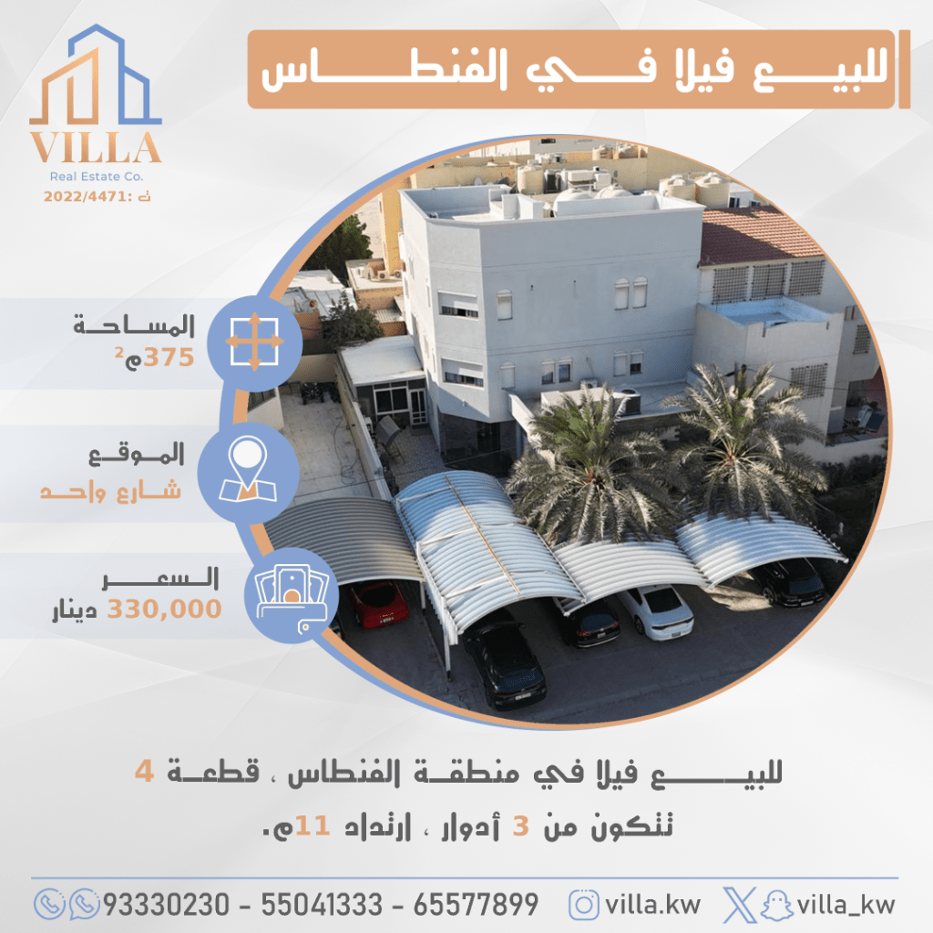 For sale: A villa in the Fintas area, Plot 4, with an area of 375 square meters, located on a single street. It consists of 3 floors, with a setback of 11 meters. Price: 330,000 Kuwaiti Dinars. For inquiries, contact mobile numbers: 1, 2, 3.