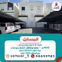 For sale: An investment villa in Al-Masayel, 400 square meters, with front and back yards and a setback opposite Al-Adan. It consists of 3 floors and a basement, fully rented as apartments, with an income of 4260 dinars. Sale price: 750,000 dinars.