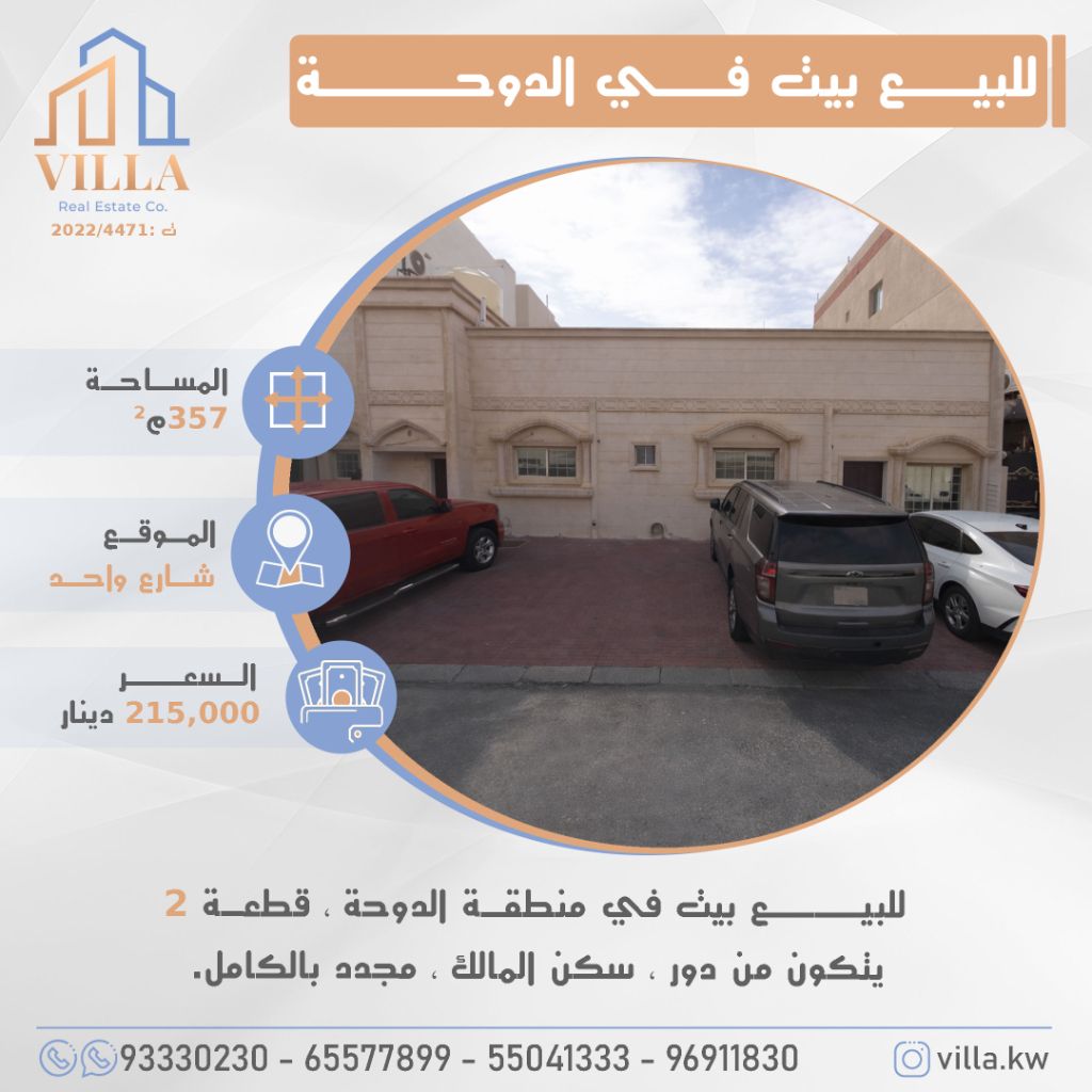 For sale, a house in the Doha area, plot 2, area 357 sqm, located on a single street, consisting of one floor, owner-occupied, fully renovated. Price 215,000 Kuwaiti Dinars. For inquiries, mobile 1, mobile 2, mobile 3, mobile 4.