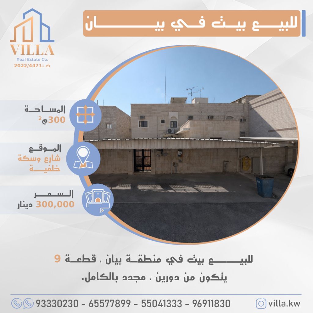 For sale: A house in the Bayan area, Plot 9, with an area of 300 square meters. The location is on a street with a back alley. It consists of two floors and is fully renovated. Price: 300,000 Kuwaiti Dinars. For inquiries, call mobile 1, mobile 2, mobile 3, mobile 4.