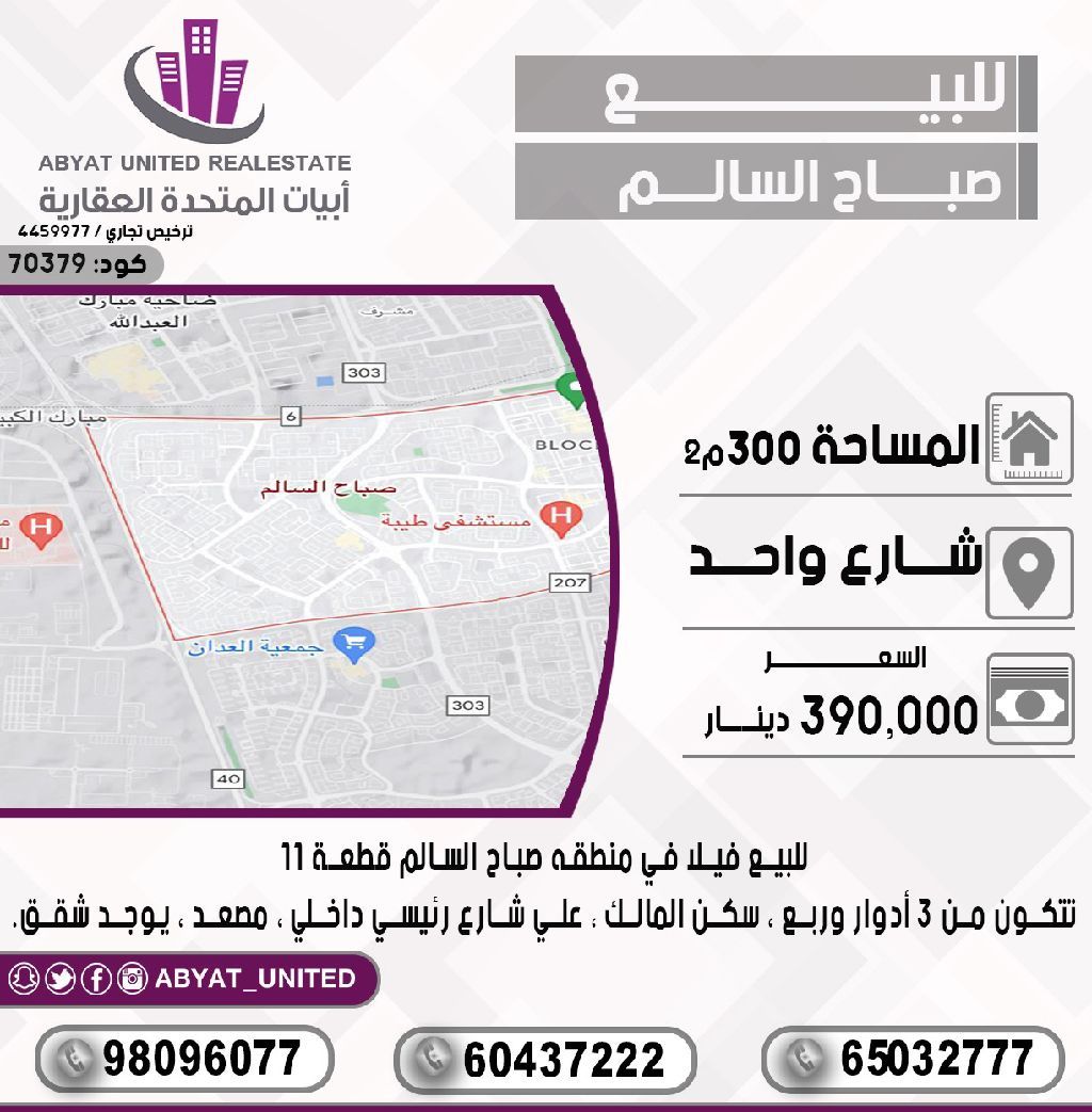 For sale, a villa in Ali Sabah Al Salem, plot 11. Location: one street. Area: 300 square meters. It consists of 3 floors and a quarter, owner-occupied, on an internal main street, with an elevator, and includes apartments. For inquiries, mobile number 1, mobile number 2, mobile number 3. Price: 390 thousand dinars. Code: 70379.