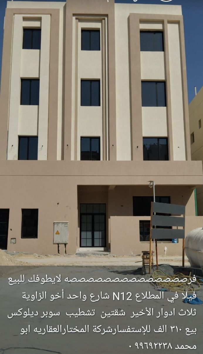 Opportunity not to be missed for sale a villa in Al - Mutlaa, N12, one street, corner lot, three floors, the last floor has two apartments, super deluxe finishing, selling for 310000. For inquiries, contact Al - Mukhtar real estate Company, Abu Muhammad