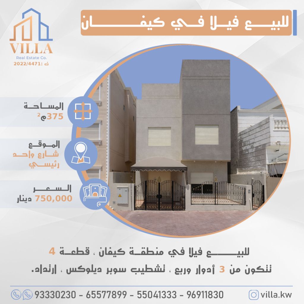 For sale, a villa in the Kaifan area, plot 4, area 375 sqm, located on one main street, consisting of 3 floors and a quarter, super deluxe finishing, setback. Price 750,000 Kuwaiti Dinars. For inquiries, mobile 1, mobile 2, mobile 3, mobile 4.
