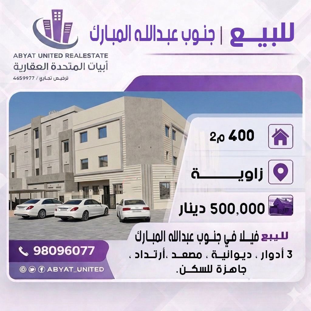For sale, a villa in South Abdullah Al-Mubarak Al-Sabah. The location is on a corner. The area is 400 square meters. It consists of 3 floors, a diwaniya (reception area), an elevator, a setback, and is ready for occupancy. For inquiries, mobile number 1. Price: 500,000 dinars. Code: 4.
