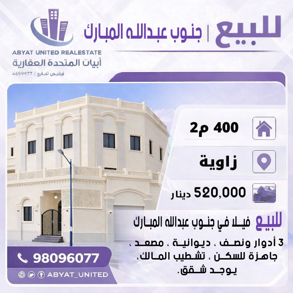 For sale, a villa in South Abdullah Al-Mubarak Al-Sabah, corner location, area 400, consisting of 3 floors and a half, diwaniya, elevator, ready for occupancy, owner's finishing, includes apartments. For inquiries, mobile 1, price 520 thousand dinars, code 4.