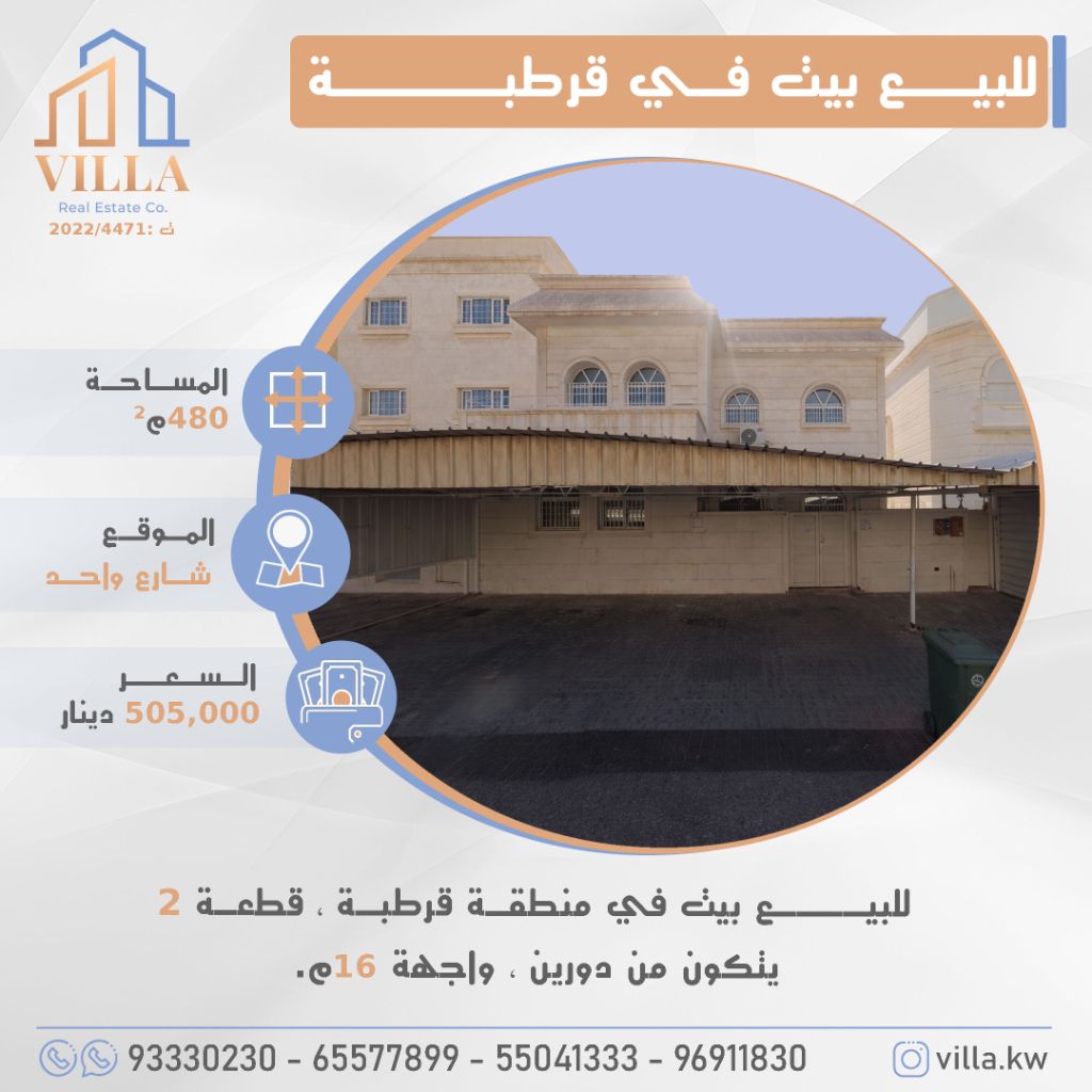 For sale: A house in the Cordoba area, Plot 2, Area 480 sqm, Location: One Street, consists of two floors, frontage 16m. Price 505,000 Kuwaiti Dinars. For inquiries, mobile 1, mobile 2, mobile 3, mobile 4.