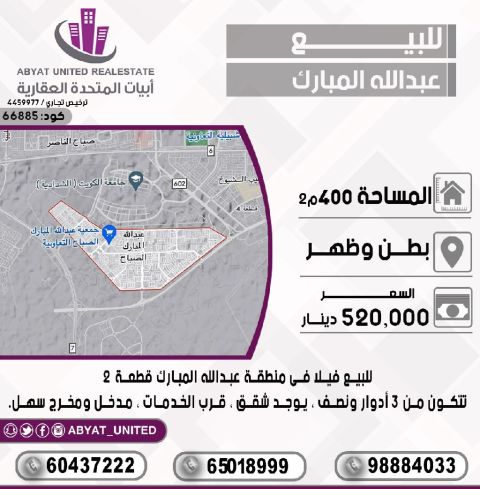 For sale: A villa in Abdullah Al-Mubarak Al-Sabah area, plot 2, location: front and back, area 400 square meters, consisting of 3.5 floors, includes apartments, near services, easy access. For inquiries, mobile 1, mobile 2, mobile 3. Price: 520 thousand dinars. Code: 66885.