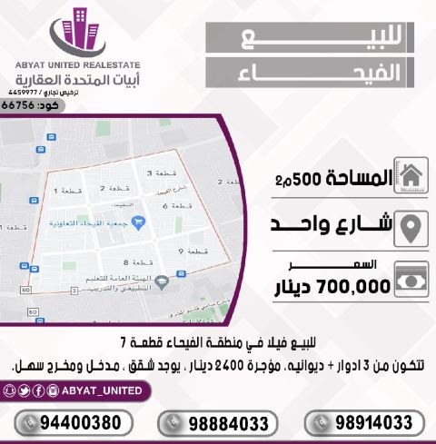 For sale: A villa in Al-Faiha area, plot 7, with front and back access. The area is 500 square meters, consisting of 3 floors, a diwaniya, and it is rented for 2400 dinars. There are apartments, and the entrance and exit are easy. For inquiries, mobile 1, mobile 2, mobile 3. Price: 700,000 dinars. Code: 66756.