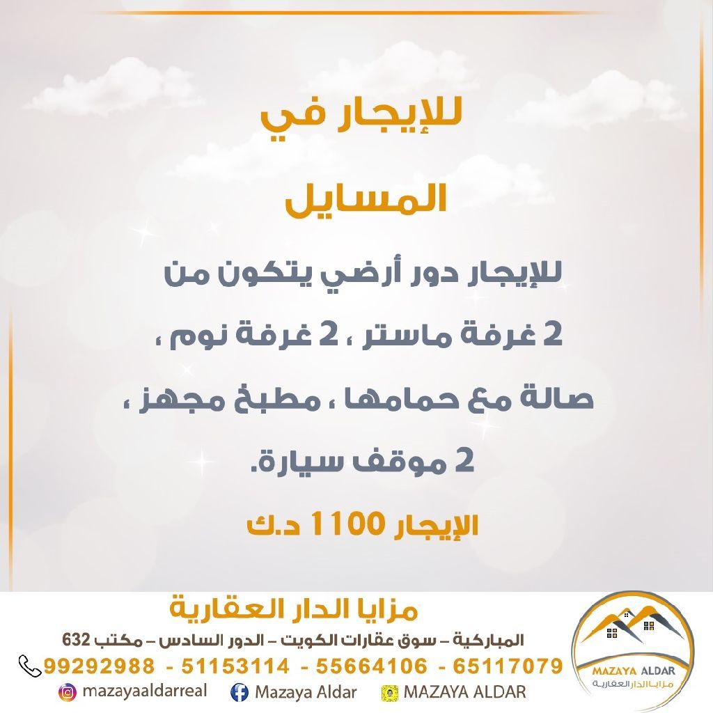 للإيجار: دور أرضي في ضاحية المسايل، يتكون من 2 غرفة نوم رئيسية، 2 غرفة نوم، صالة مع حمامها الخاص، مطبخ مجهز بالكامل، وموقفين للسيارات. للجادين فقط، يمنع الوسطاء. الإيجار 1100 دينار. للاستفسار، اتصل عبر الهاتف المحمول.