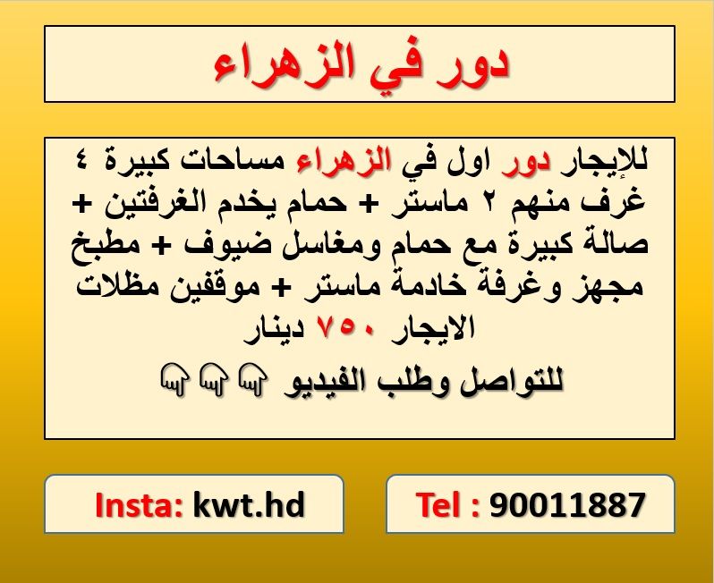 للإيجار دور أول في الزهراء، مساحات كبيرة، 4 غرف منها 2 ماستر + حمام يخدم الغرفتين + صالة كبيرة مع حمام ومغاسل ضيوف + مطبخ مجهز وغرفة خادمة ماستر + موقفين مظلات. الإيجار 750 دينار. للتواصل وطلب الفيديو