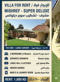 للإيجار: فيلا في مشرف بتشطيب سوبر ديلوكس وحديقة كبيرة مساحتها 750 متر مربع. موقع مميز جداً مقابل ساحة مسجد وفرع جمعية. تتكون من دوانية منفصلة + 5 غرف نوم منها 3 غرف ماستر، حمامين مشتركين، غرفة غسيل، غرفة مربية ماستر، صالة كبيرة، مطبخ كبير مجهز، وجراج داخلي. للأجانب والمقيمين فقط بناءً على رغبة المالك. الإيجار: 1600 دينار كويتي. للاستفسار والتفاصيل.
