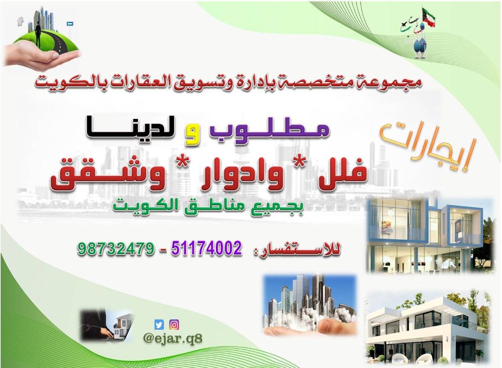 For rent: a villa in Al-Siddiq, corner location, 3 floors and a quarter. Details: Ground floor: diwaniya (reception area) + living room + kitchen + dining room. First floor: 3 bedrooms (including a master bedroom) with a shared bathroom. Second floor: 2 bedrooms (including a master bedroom). Roof: maid's room with its own bathroom + laundry room. Covered parking. Rent: 1650 Kuwaiti dinars, including electricity and water. We also have more apartments and floors available.