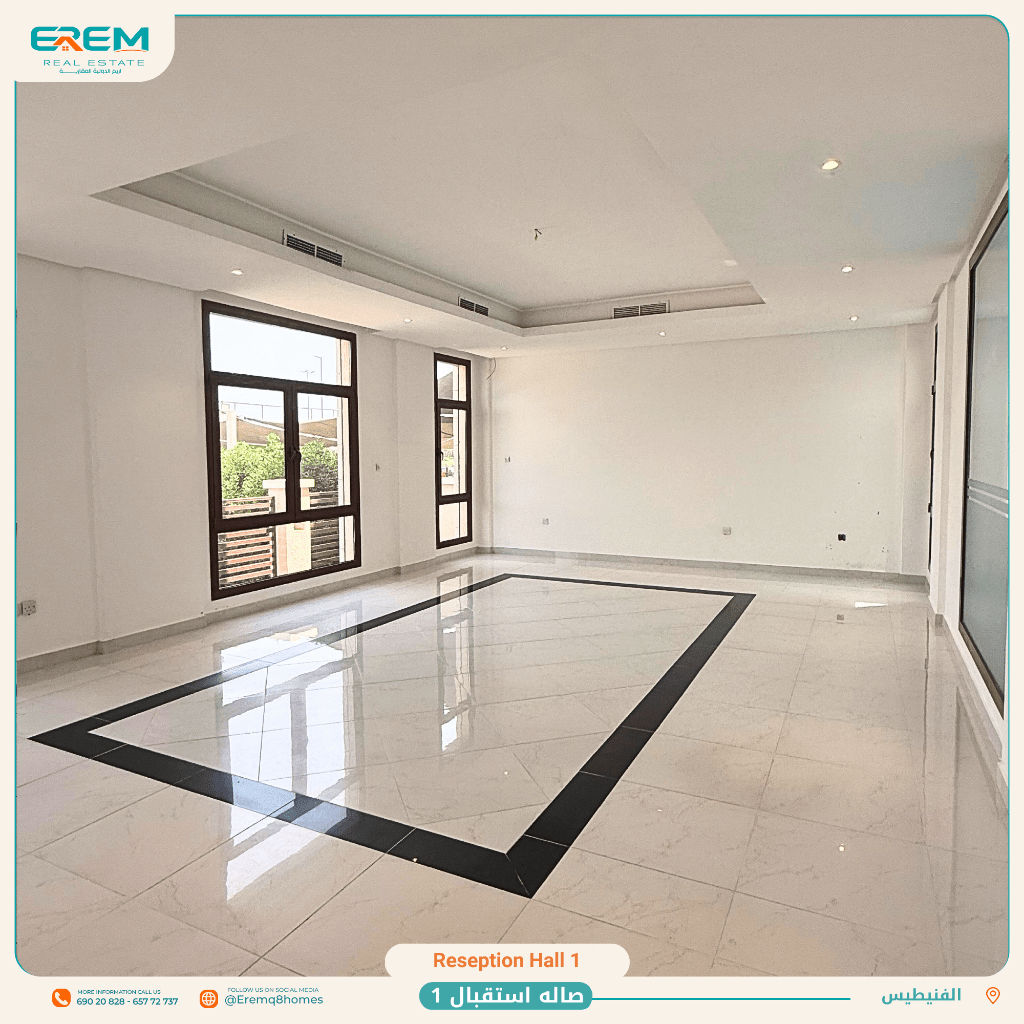 For lovers of luxury and distinction, for rent a villa in Fintas with front and back, large setback, garden, two and a half floors with a basement, swimming pool, internal elevator, driver's room, 5 master bedrooms. The basement includes parking, a diwaniya with a bathroom, and a private kitchen. The ground floor has two halls with a guest bathroom, dining hall, master bedroom, and main kitchen. The