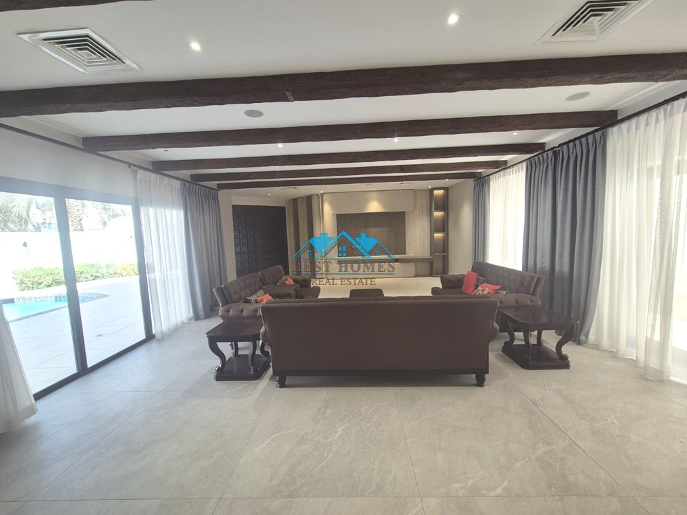 VIP modern villa in Qurtuba, ideal for diplomats. It features 2 living areas with a service kitchen, 5 master bedrooms with attached bathrooms, 2 main kitchens, an outside 2 - bedroom quarter with a kitchen, a big yard area with an outdoor swimming pool, and 2 garage parking spaces. rent is KD3000. Call or WhatsApp for viewing
