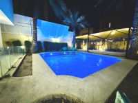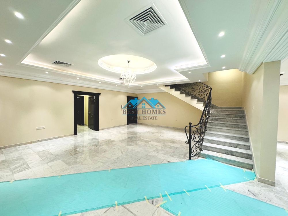 A huge luxury villa with 5 bedrooms is available for rent in Salwa. The ground floor features 2 living rooms, a guest bathroom, one master bedroom, 2 kitchens, a driver's room, an outdoor garden with a swimming pool. The first floor has a living room, a kitchen, 2 master bedrooms, 2 bedrooms with a shared bathroom. The second floor includes a maid's room with a bathroom, a laundry room, and a terrace
