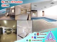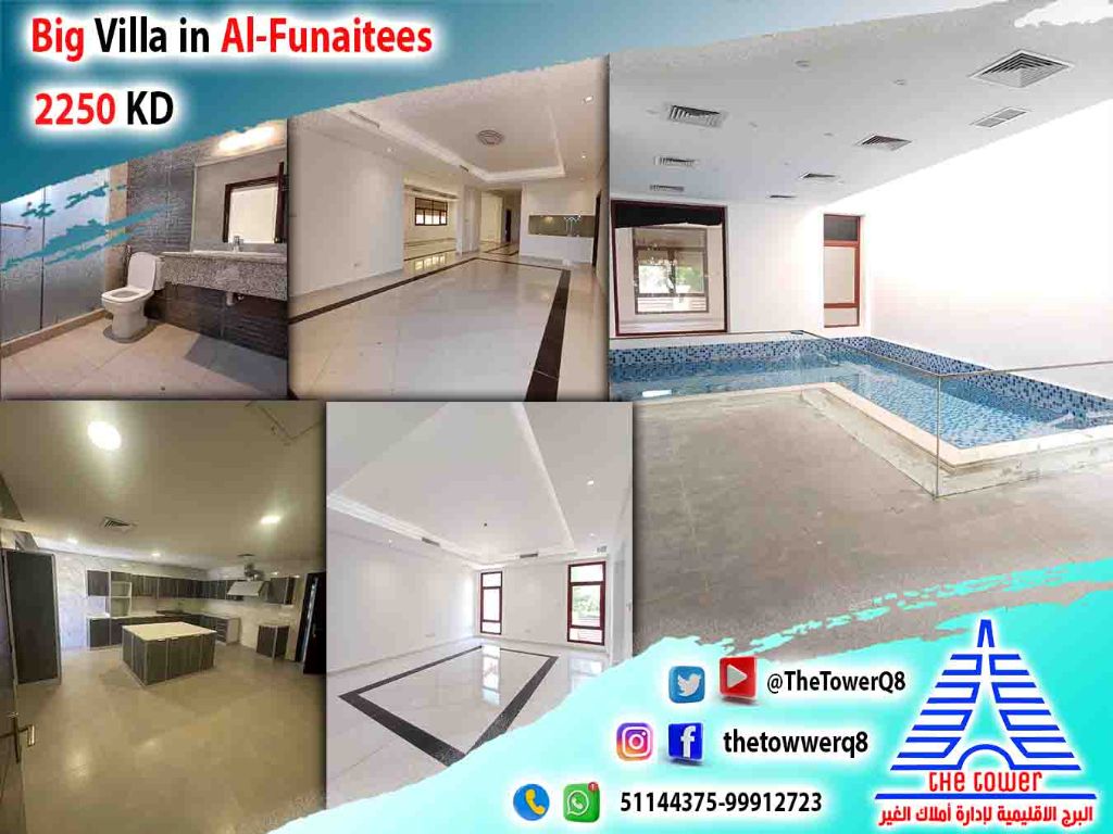 For rent in Fintas, a villa with front and back entrances and a large setback - two and a quarter floors and a basement - large outdoor garden + swimming pool - 5 master bedrooms - maid's room with bathroom - driver's room - diwaniya with bathroom, laundry, and kitchen - 3 living rooms - 3 kitchens - shaded parking. Rent is 2250 Kuwaiti dinars. For inquiries and details.