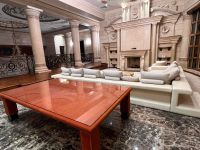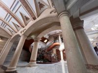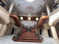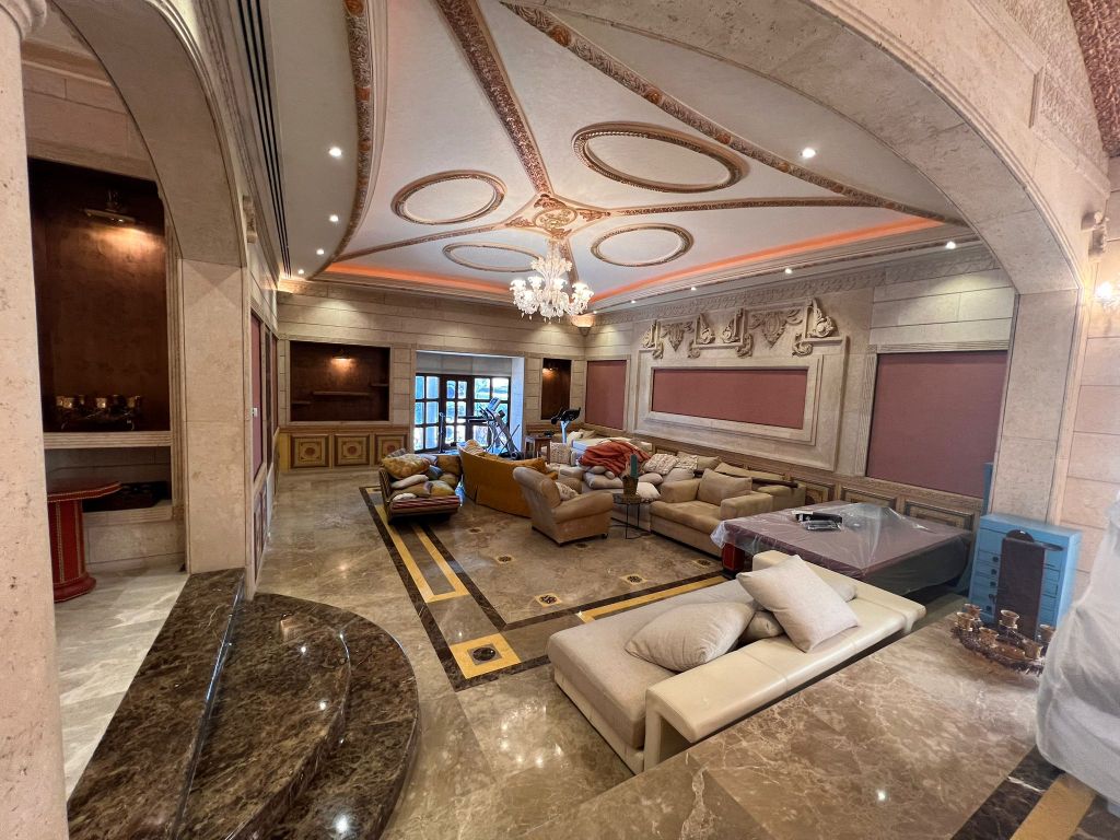 For rent, a villa (palace) in the Surra area - ambassador - diplomatic residence. The property consists of a basement with a fully equipped central kitchen, a food elevator, parking for more than 10 cars, a storage room, a driver's room, a servants'room, and a storage room for items and equipment. The ground floor consists of a luxurious lobby with open columns, a painted dome, and a staircase