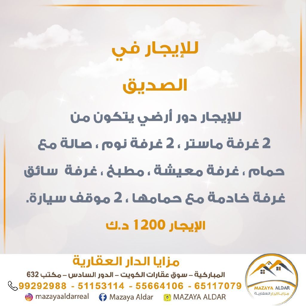 For rent: A ground floor apartment in Al Sadeeq suburb, consisting of 2 master bedrooms, 2 bedrooms, a hall with a bathroom, a living room, a kitchen, a driver's room, a maid's room with its own bathroom, and 2 parking spaces. For serious inquiries only, brokers are prohibited. Rent is 1200 dinars. For inquiries, contact via mobile.