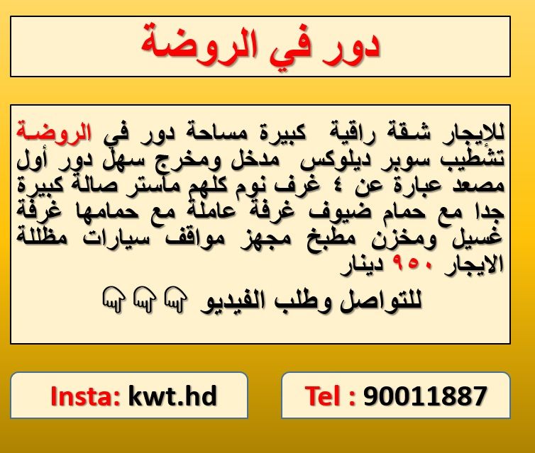 For rent A luxurious, large ground - floor apartment in Al Rawda - with super deluxe finishing. easy access and exit. First floor with elevator. It consists of 4 master bedrooms, a very large living room with a guest bathroom, a maid's room with its own bathroom, a laundry room, and a storage room. Equipped kitchen. Covered parking spaces. rent 950 dinars. For contact and video request