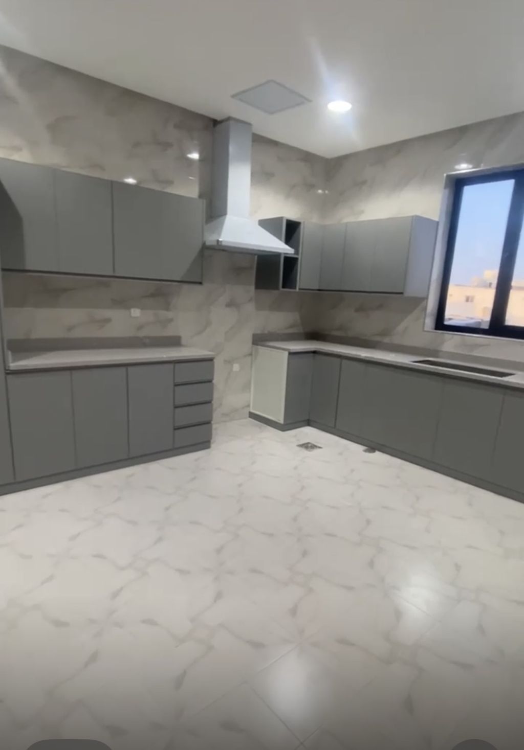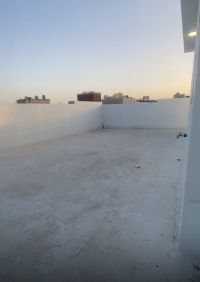 For rent: A full floor with a large roof in Al Zahra, new, large area, first occupant, VIP finishing. It consists of 4 bedrooms, including 2 master bedrooms with dressing rooms, a large living room, a fully equipped kitchen, servant's room with its own bathroom, and a laundry room. There are 5 bathrooms and 2 shaded parking spaces. Rent is 900 dinars. For contact.