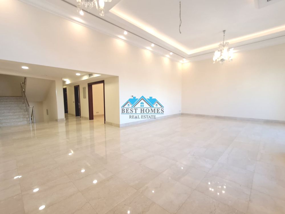 Luxury 6-bedroom villa with private entrance, balcony, and ample parking in Khaldiya. Basement floor: large living hall with bathroom and private entrance, one regular bedroom with bathroom, Devaniya with bathroom, kitchen. Ground floor: dining area, kitchen. Floor 1: maid's room, laundry room, kitchen. Floor 2: good-sized living hall, three master bedrooms with wardrobes. Floor 3: master bedrooms with wardrobes.