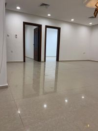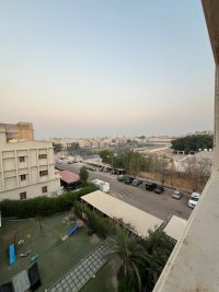For rent in Al-Khalidiya, third floor with elevator: five bedrooms with electric shutters, three bathrooms including a master bedroom, large living room, equipped kitchen, maid's room with its own bathroom, laundry area, balcony, two covered parking spots, and additional parking available near the school fence. Rent is 800 dinars.