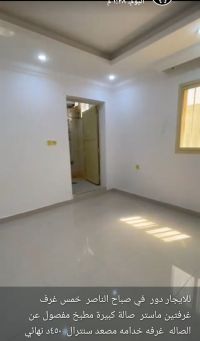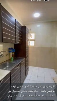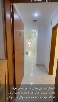 For rent: a floor in Sabah Al Nasser with five rooms, including two master bedrooms, a large living room, and a kitchen separate from the living room. Includes a maid's room, elevator, and central air conditioning. Rent is 450 dinars at the end of the month. For inquiries, contact Al Mukhtar Real Estate Company, Abu Muhammad, Azra for offices, license number 20228825.