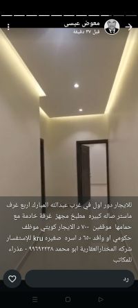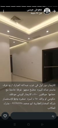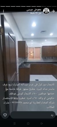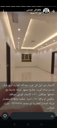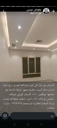 Golden Home Real Estate Foundation. Contact this number: 94003538. For rent: a floor with a balcony in Jabriya, super deluxe, consisting of 5 rooms (3 master rooms + 2 rooms with a bathroom between them), a living room, a guest bathroom and laundry, a kitchen. The house was occupied by the owner. 3 car parking spaces. Rent: 800 KD. For inquiries: Al-Mukhtar Real Estate Company, Abu Mohammed.
