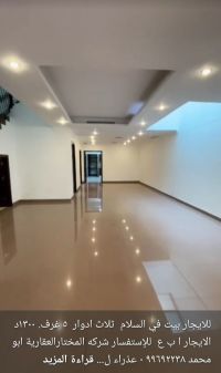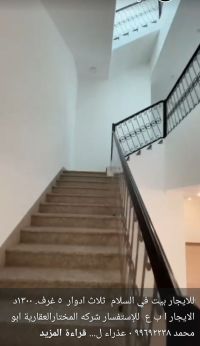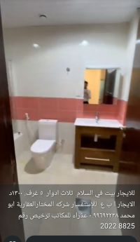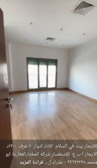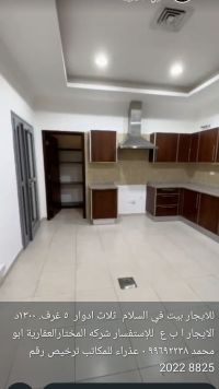 For rent: a house in Al-Salam area with three floors, 5 rooms, for 1300 dinars. For inquiries, contact Al-Mukhtar Real Estate Company, Abu Muhammad. License number: 20228825.