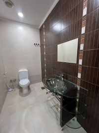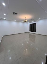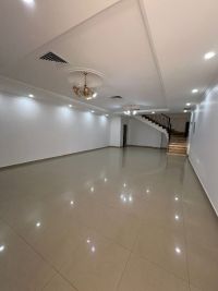 For rent: A villa in Al-Rumaithiya, Area 10, with 3 floors and an elevator. It has 5 bedrooms, including 2 master bedrooms, a living room, a guest room, a guest bathroom, a laundry room, a driver's room, and a fully equipped kitchen. It also includes 5 parking spaces. The rent is 1400 dinars. For contact.