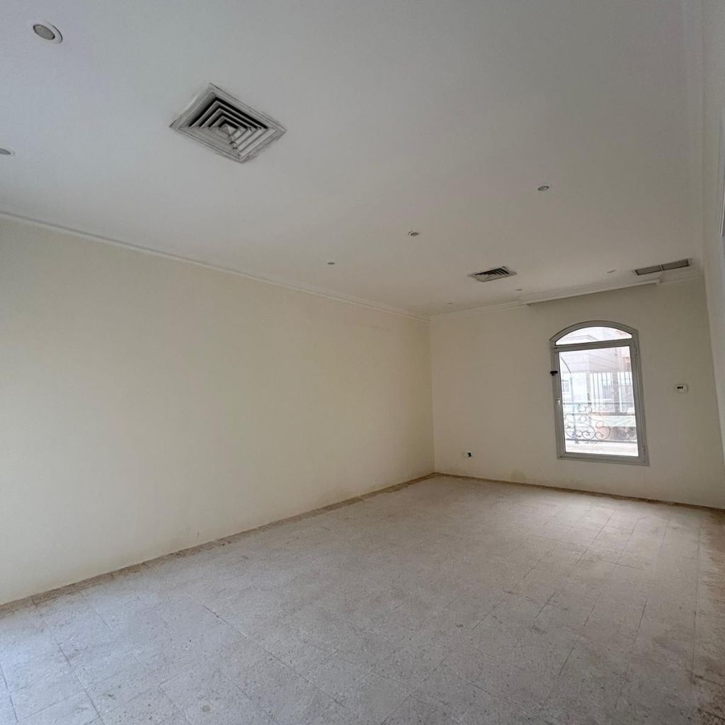 A residential house for rent in Abdullah Mubarak. The house has 3 entrances and consists of two and a quarter floors. The ground floor includes a courtyard, a master Majlis, a small room, a hall, a guest bathroom, a bedroom, a kitchen with a laundry room, a storage room, a maid's room with its own bathroom, and a laundry room with a courtyard. The first floor consists of 5 bedrooms (3 of them are master