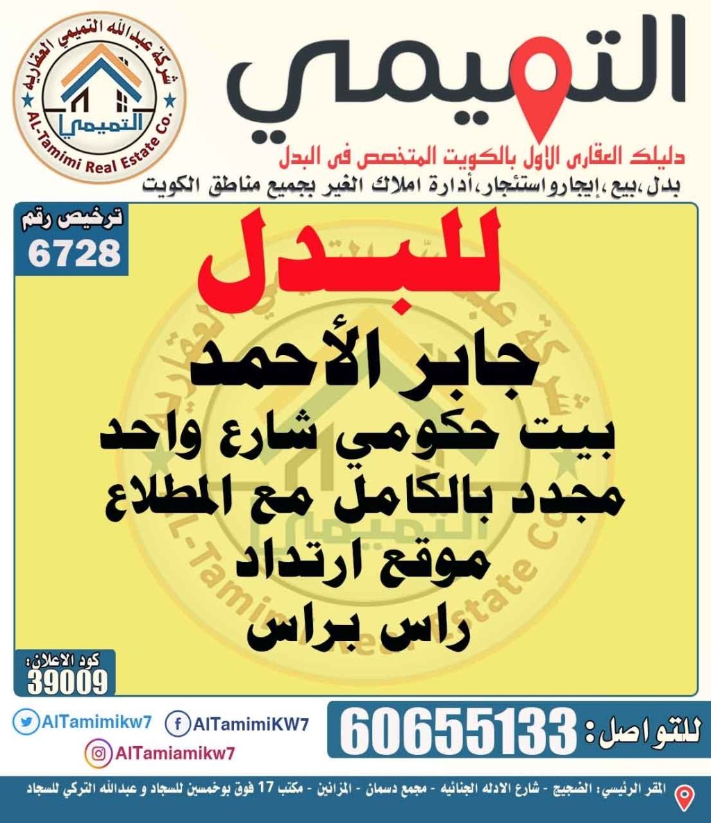 For exchange: a government house in Jaber Al-Ahmad, Street One, 400 square meters, renovated, with land, location, and setback in Al-Mutlaa, head-to-head.