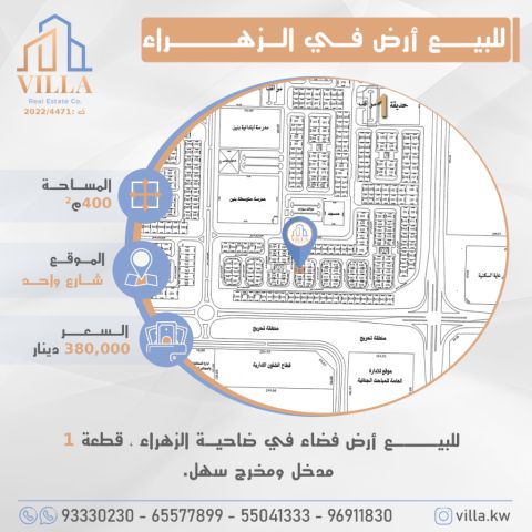 For sale: a vacant land in Al Zahraa suburb, plot number 1, area 400 square meters, location on a single street, easy access and exit. Price 380,000 Kuwaiti dinars. For inquiries, mobile 1, mobile 2, mobile 3, mobile 4.