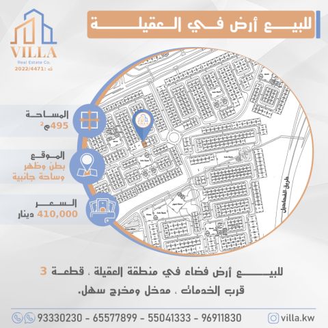 For sale: Vacant land in the Aqeela area, Plot 3, Area 495 sqm, Location with front and back access and a side yard, Near services, Easy entrance and exit. Price 410,000 Kuwaiti Dinars. For inquiries, mobile 1, mobile 2, mobile 3, mobile 4.