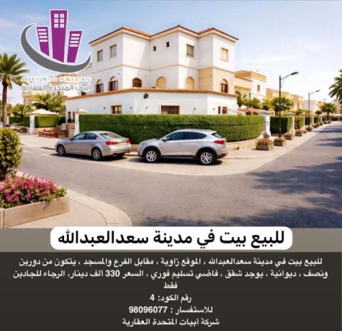 For sale: a house in Saad Al-Abdullah City, corner location, opposite the branch and mosque. It consists of two and a half floors, a diwaniya, and includes apartments. Vacant and ready for immediate delivery. Price: 330,000 dinars. Serious inquiries only. Code number 4 for inquiries. Commercial license / 4459977, United Abiyat Real Estate Company.