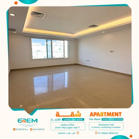 للإيجار في 'غرب مشرف'، شقة تشطيب سوبر ديلوكس - تتكون من صالة استقبال، 3 غرف منها ماستر، مطبخ، غرفة مربية مع حمام، ومواقف مظللة. الإيجار: 470 دينار كويتي.