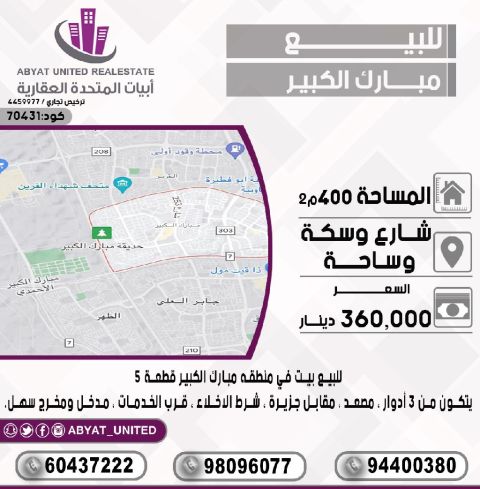 For sale: A house in Mubarak Al-Kabeer area, Block 5. Location: Street, alley, and square. Area: 400 square meters. It consists of 3 floors, elevator, opposite an island, condition: vacant, near services, easy entrance and exit. For inquiries, mobile number 1, mobile number 2, mobile number 3. Price: 360,000 dinars. Code: 70431.