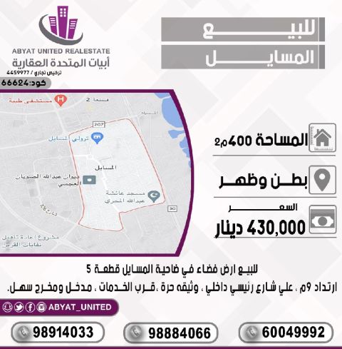 For sale: Vacant land in Al-Masayel suburb, plot number 5, location: Batan and Thahr, area 400 sqm, setback 9m, on an internal street, freehold document, near services, easy access. For inquiries, mobile 1, mobile 2, mobile 3. Price: 430,000 dinars. Code: 66624.