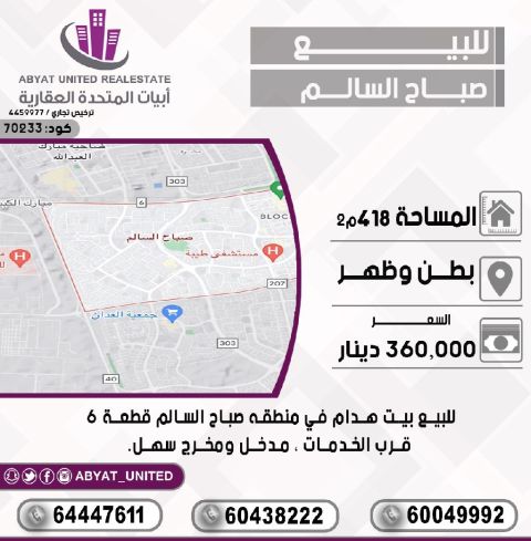 للبيع: بيت في ضاحية صباح السالم، المساحة 300 متر مربع، الموقع بطن وظهر، ارتداد كبير، يتكون من دورين وربع، نظام سكن، السعر 300 ألف دينار، رقم الكود 67034 للاستفسار - شركة أبيات المتحدة العقارية.