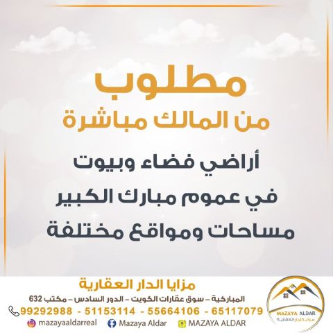 Directly from the owner, vacant lands and houses are wanted in all areas of Mubarak Al-Kabeer, with various areas and locations. For inquiries, contact via mobile.